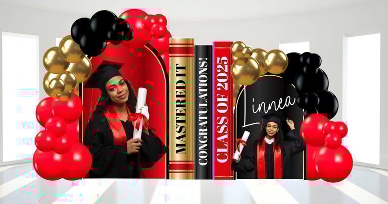 Make their big day unforgettable with a stunning custom arched backdrop! This unique setup features the graduate’s name, two favorite photos, and a heartfelt message — beautifully designed with bold colors and a sleek, modern arch that steals the spotlight. It’s the perfect photo op and party centerpiece all in one. Best of all, the graduate gets to keep the personalized arched backdrop as a one-of-a-kind keepsake to remember their milestone in style!